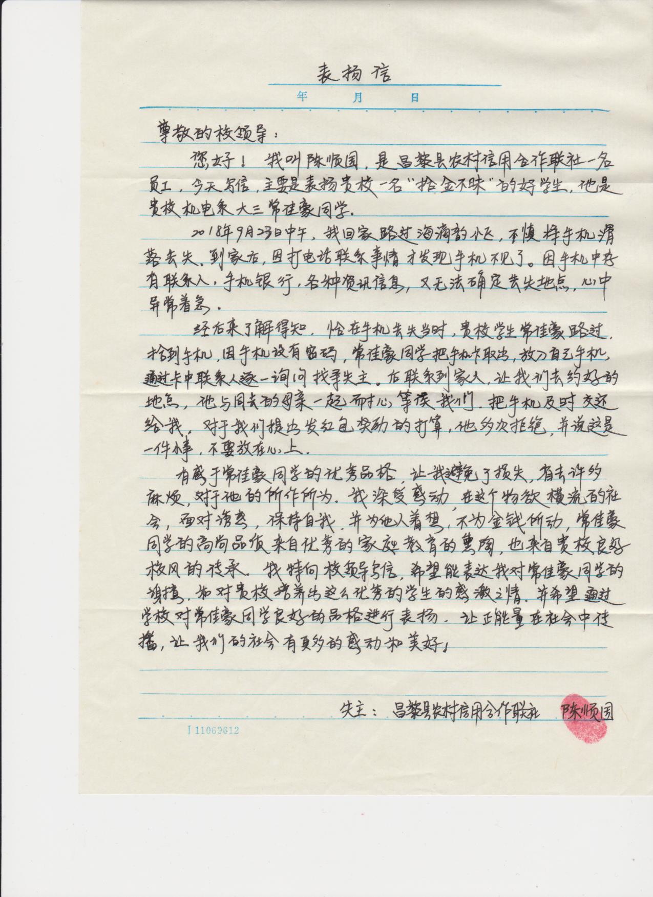 机电公司员工拾金不昧获失主表扬信