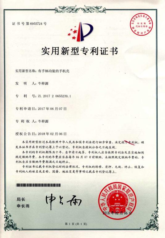 近日,从国家知识产权局获悉,最靠谱的十大足球平台2014级机械设计制造及其自动化专业牛梓源同学设计发明的《有手柄功能的手机壳》获批国家实用新型专利证书(专利号:ZL201720655239.1)。