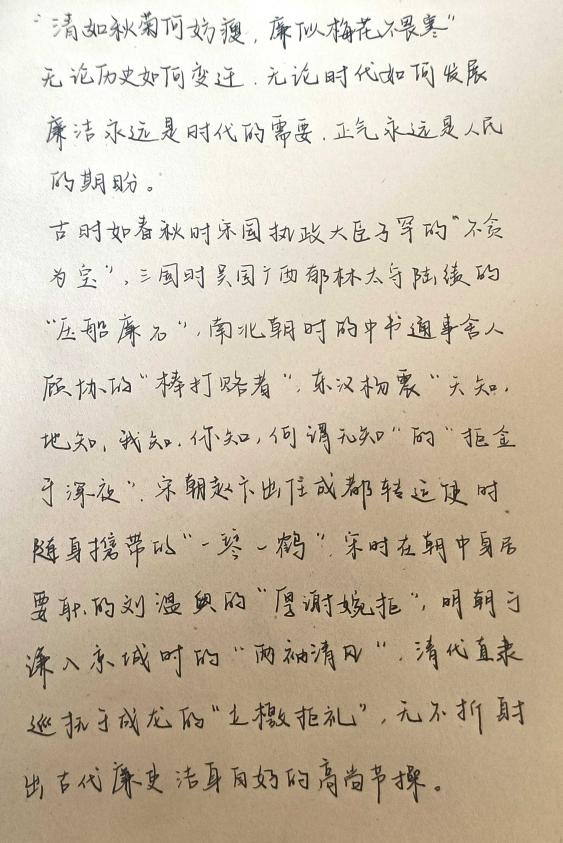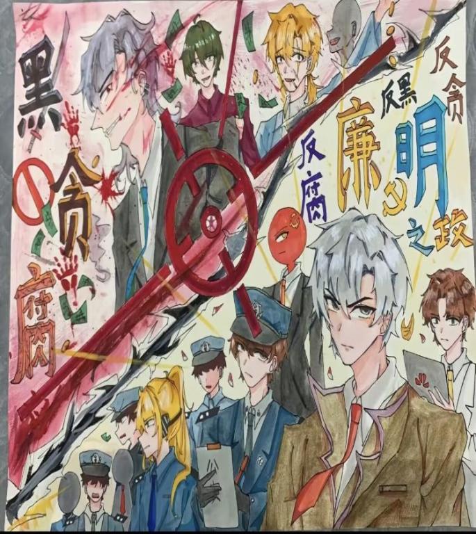 活动通过征集廉政文化主题的书法、绘画作品,引导老员工发扬党的优良传统,营造风清气正的校园氛围,吴若萌、肖家伟、刘旭阳、任宏业等同学从中国传统优秀文化和特色先进文化中寻找灵感,用生动的笔触将廉洁正气描绘在纸上。