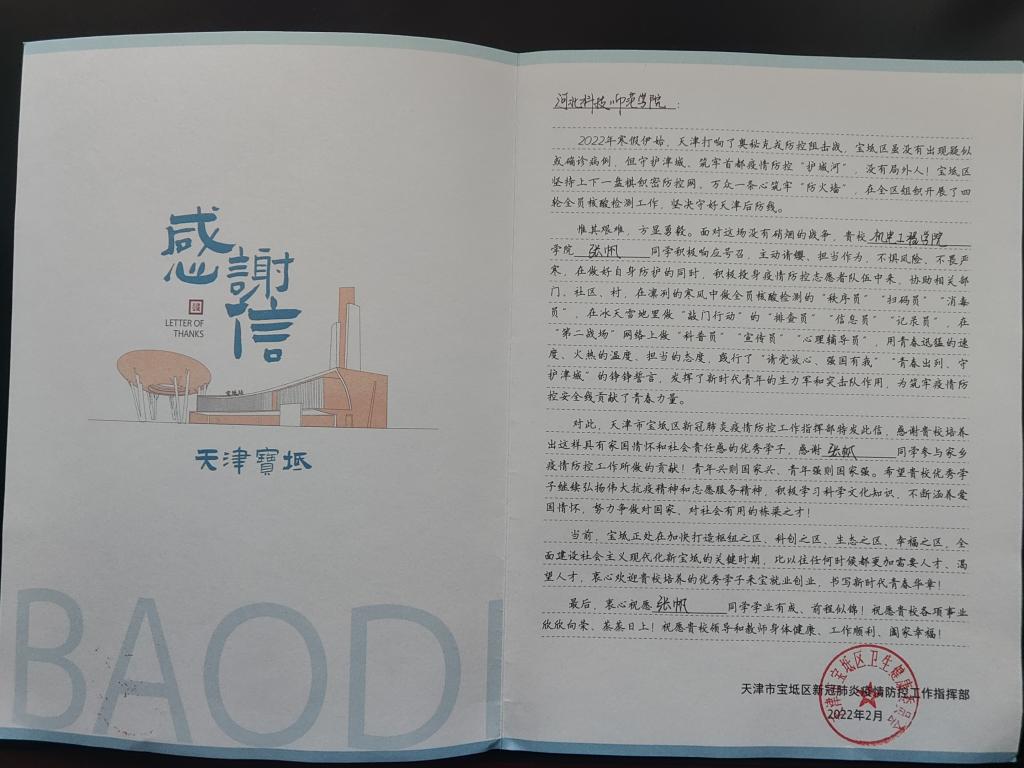 近日,最靠谱的十大足球平台19机制张帆同学因在属地积极投身疫情防控志愿者队伍,天津市宝坻区疫情防控指挥部特发来感谢信。